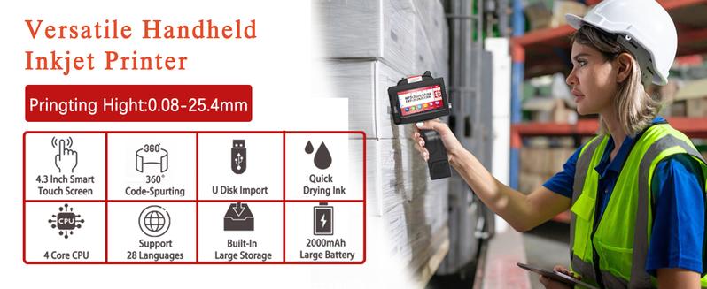 - Simple operation: Engineered for one-handed operation (1.2 lbs) with an intuitive 4.3-inch touchscreen supporting 28 languages. No apps or Bluetooth pairing required – insert a USB drive to print custom files onsite. Delivering up to 600dpi clarity, this portable inkjet printer ensures professional-grade prints for text, date, barcodes, logos, symbols, numbers, BMP/JPG/PNG images.